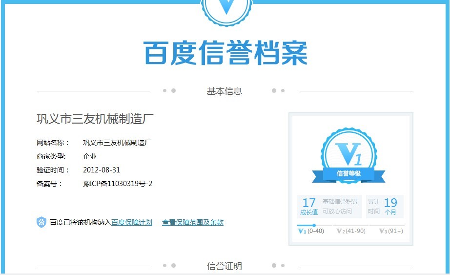 百度信誉V,是通过对网站及网站背后的经营实体的资质、真实性认证、*行为、消费承诺意愿、口碑评价等数据的集中,以信誉评级和信誉成长值等方式,把网站的综合信誉情况呈现给网民,作为网民决策的参考依据。