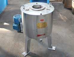 2. 把离心式滤油机的电源合上,然后加入盐化后的毛油,毛油从油斗的流油管经过离心机上端空心轴流到转鼓底部的尼龙小圆盘上,小圆盘迅速将毛油均匀分流到转鼓的内壁上,这时候高速旋转的转鼓产生的强大离心力将不同质重的固液分离,毛油加入后的2-3分钟把电源关掉,转鼓逐渐停转后净油自动流出,达到精滤目的,前后只需5-6分钟*,每小时过滤量为250-350斤油。
